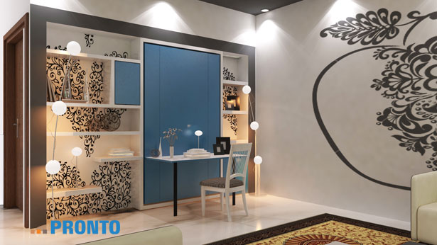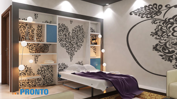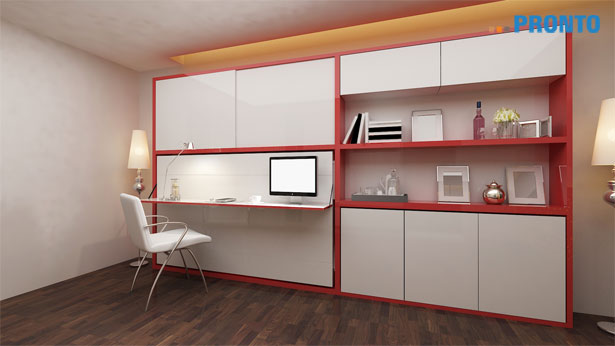 By day, the wall bed stands quietly inside a marvellous looking wall, while a large 5 feet long and 3 feet wide Dining Table is available whole day not just to eat but also for study. At night a large queen size bed comes down with a simple single pull without moving any furniture even by an inch. What’s more? The items placed on dining table remains on dining table without falling. By adding Pronto custom shelves, a lot of decorative and useful storage can be created on the wall to suit modern interior of your home. Any designer bed would shy away from our multi-tasking folding bed.